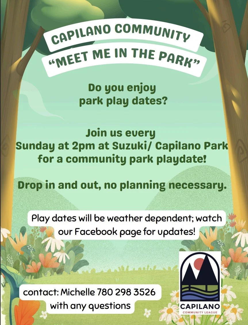 Capilano Community League May 29, 2025 Meet Me in the Park Capilano Community League May 29, 2025 Join us every Sunday at 2 p.m. for a park play date at Suzuki/Capilano Park!